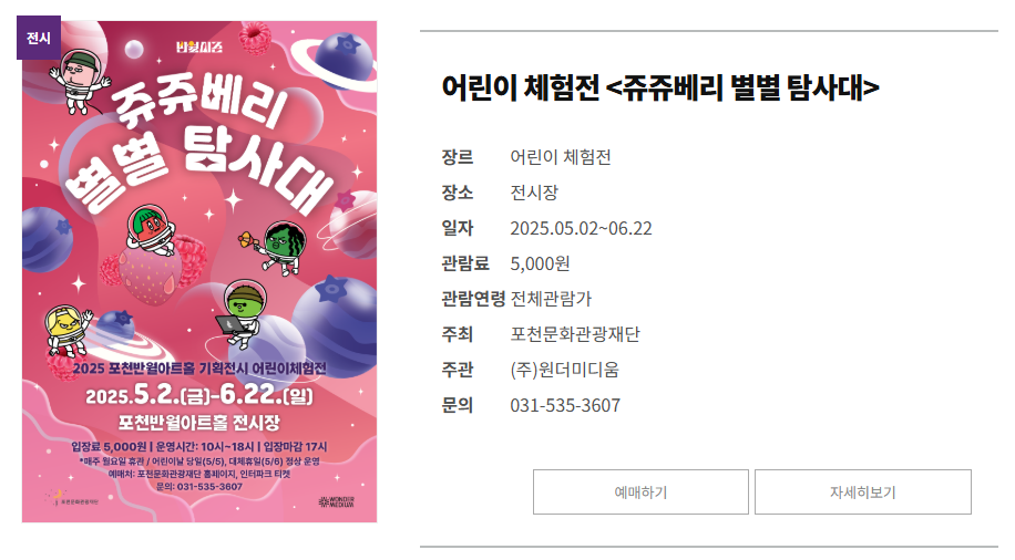 | 비용 | 유료 (사전 예매 시 어린이 50% 할인) |