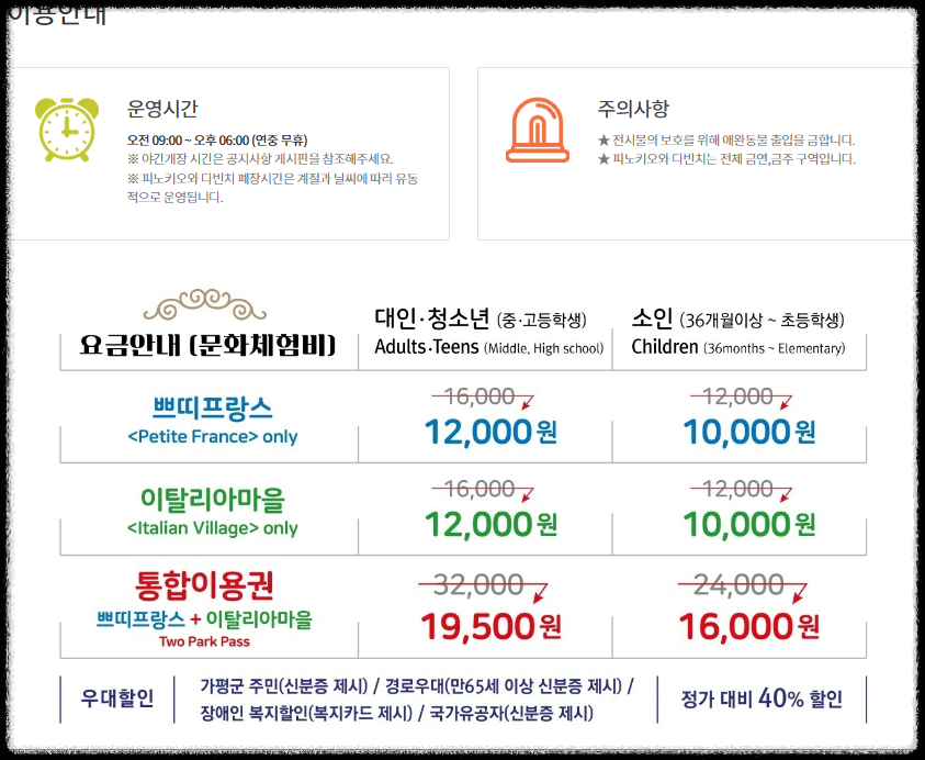 - 입장료: 성인 16,000원 / 청소년 12,000원 / 어린이 10,000원 / 유아 무료