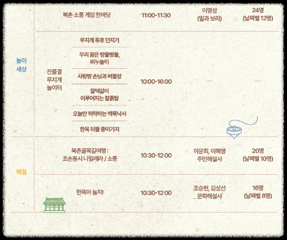 - 전통 놀이, 의상 체험, 만들기 체험